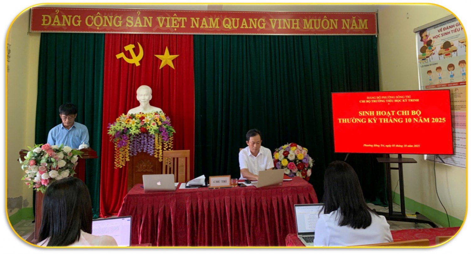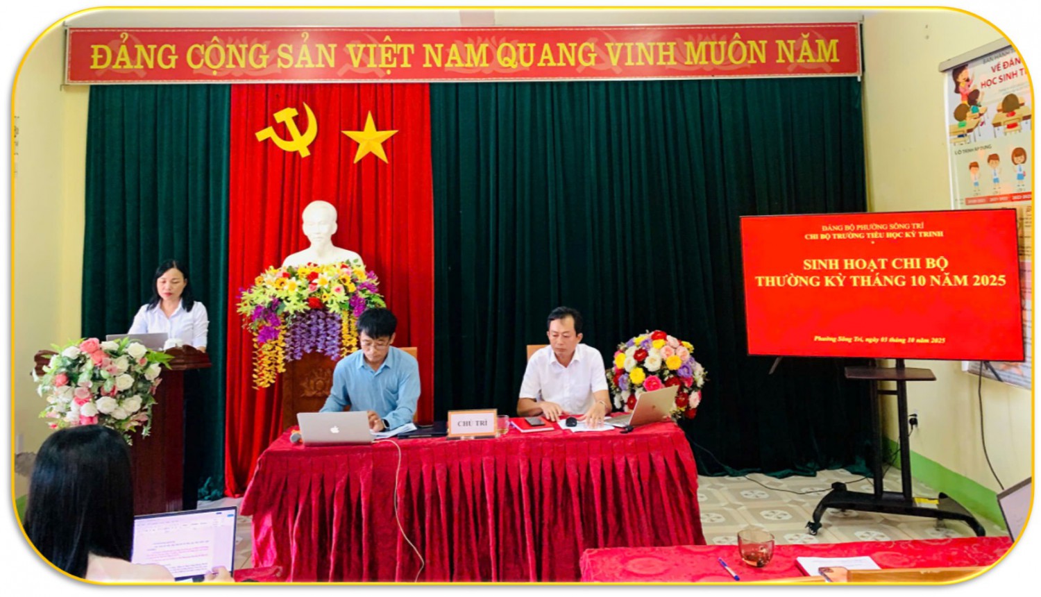 Sau khi nghe báo cáo kết quả công tác tháng 9 và phương hướng nhiệm vụ tháng 10/2025, Chi bộ Trường Tiểu học Kỳ Trinh đã dành thời gian để các đảng viên thảo luận, trao đổi ý kiến. Các đồng chí đã tập trung thảo luận về nhiệm vụ chính trị, tư tưởng, công tác phát triển Đảng; phong trào thi đua và hoạt động đoàn thể; thực trạng cơ sở vật chất, công tác dạy học tại điểm trường Hòa Lộc; nhiệm vụ năm học 2025 - 2026; vận động nhân dân, cha mẹ học sinh hỗ trợ nhà trường khắc phục sau bão; tổ chức hoạt động Đội, tổ chức tặng quà động viên các học sinh có hoàn cảnh đặc biệt khó khăn dịp tết Trung thu; công tác bảo hiểm y tế học sinh. Các ý kiến đều được chủ trì tiếp thu, tổng hợp, lựa chọn đưa vào nhiệm vụ chính trị tháng tới.